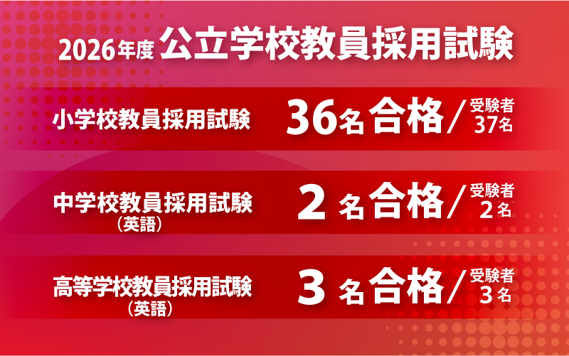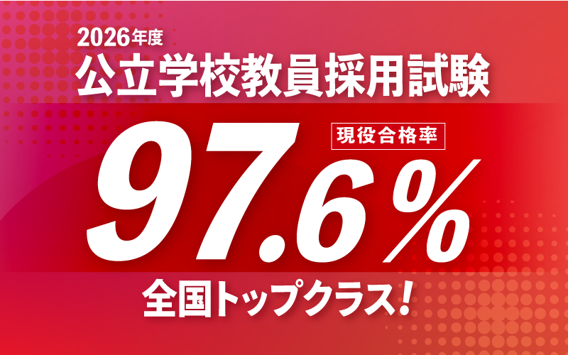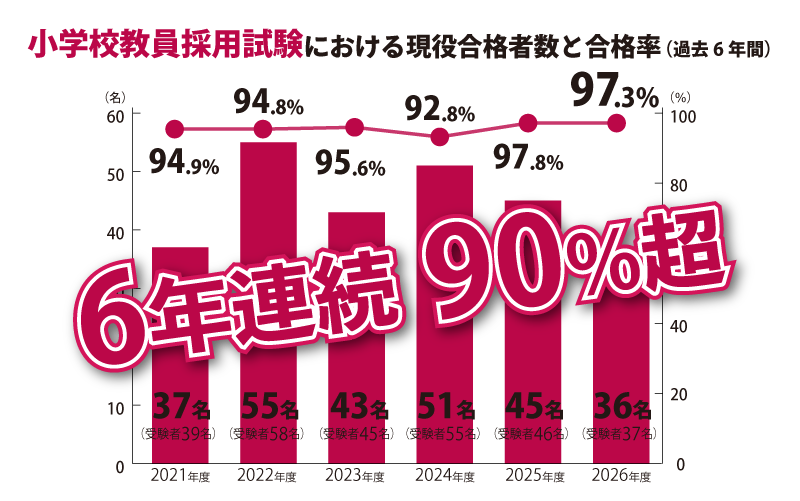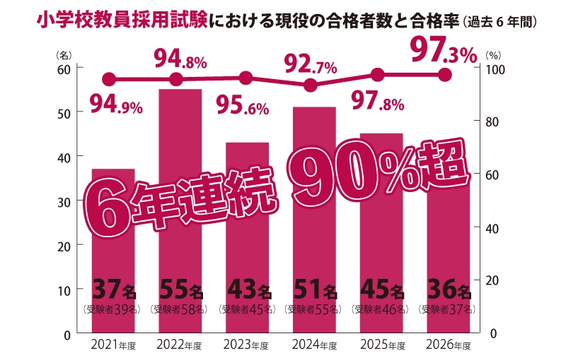 令和8(2026)年度教員採用試験(校種:小学校、中学校、高等学校)での現役合格率は97.6%と、過去最高の合格率となりました。 小学校教員採用試験の現役合格率は97.3%と6年連続9割超と全国トップクラスの実績となりました。