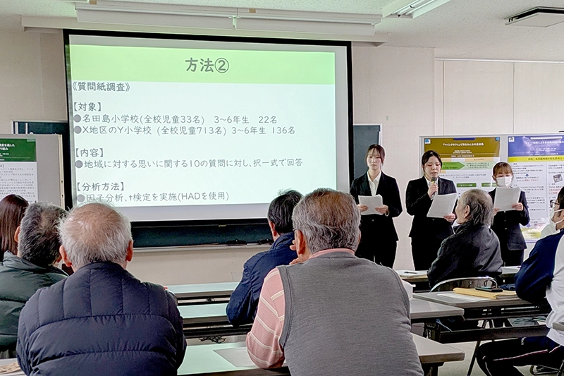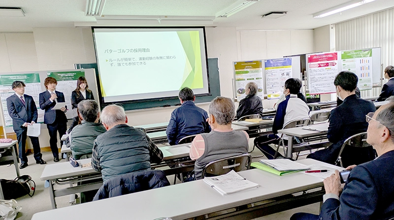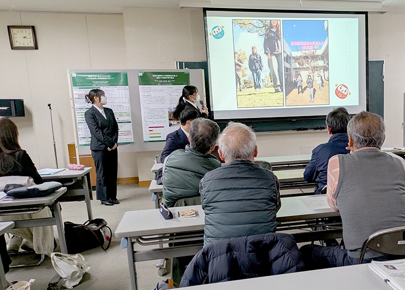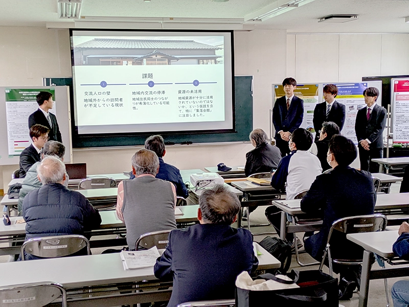 1月23日、名田島地域交流センターを会場に、2年生23名が6つのグループに分かれてこの1年間取り組んできたPBL(課題解決型学習)の成果報告会を開催しました。当日は、連携パートナーである名田島地域の住民の皆様にもご参加いただきました。