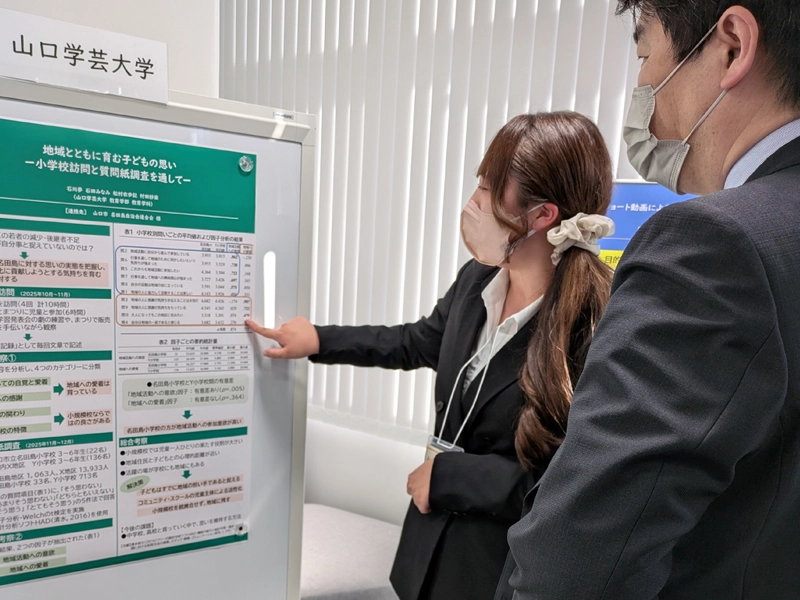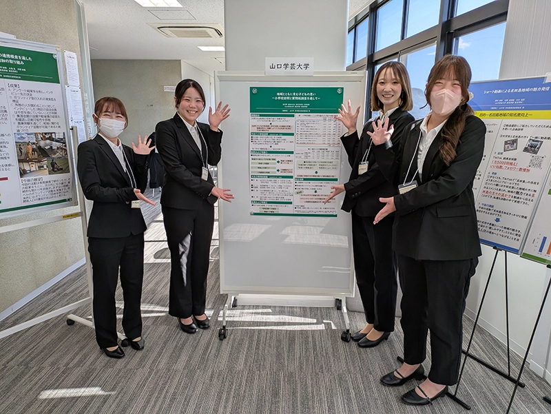 4名は原稿に頼ることなく、自らの言葉で地域とかかわる中で得た学びを伝え、聴衆を引き込む堂々としたプレゼンテーションを披露しました。発表の締めくくりには、「今回の活動を通して、将来は教師として地域と子どもたちをつなぐ役割を担いたいという思いが一層強くなった」と述べ、教育学部ならではの確かな成長が感じられる内容となりました。