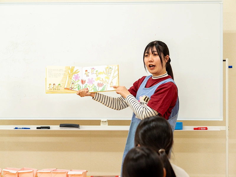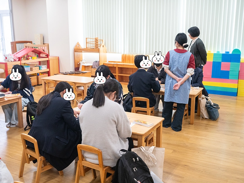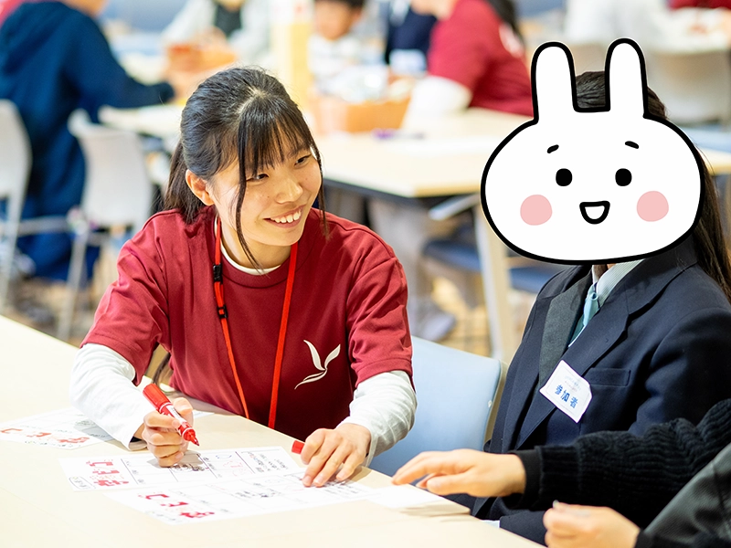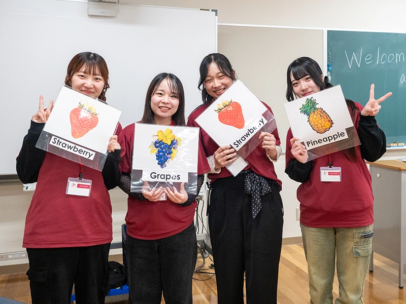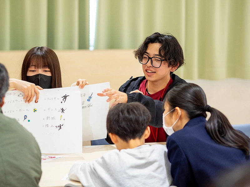 その後、学び体験として「学生の模擬授業についての検討」、「楽しい遊び体験」、「Let’s Enjoy English !(小学校英語レッスンのアクティビティ)」の中から希望する学びを体験してもらいました。学生が小学校の先生、高校生は小学生になって授業を受けて、質問や意見を発表してもらいました。遊び体験では、自分の子どもの頃のことを思い出しながら学生と一緒になって童心に帰って遊んでいたようです。小学校の英語では本学のパーキン先生と一緒に英語を思いっきり楽しむことができたようです。どの体験も高校生一人ひとりがメインとなって活動する内容で、いつの間にか高校生同士やサポート役の大学生とも打ち解けて、楽しい一時を過ごしてもらえたようです。