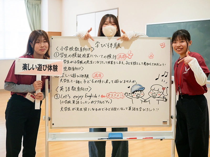 3月20日(祝)、ウエルカムプログラムとしてサークルによる演奏会の後、本学での資格や進路、強みや大事にしていることを知ってもらうために、学生たちが工夫しながら大学の紹介を行いました。また、「SPARC教育プログラム」と銘打って、そのプログラム内容の説明も行いました。